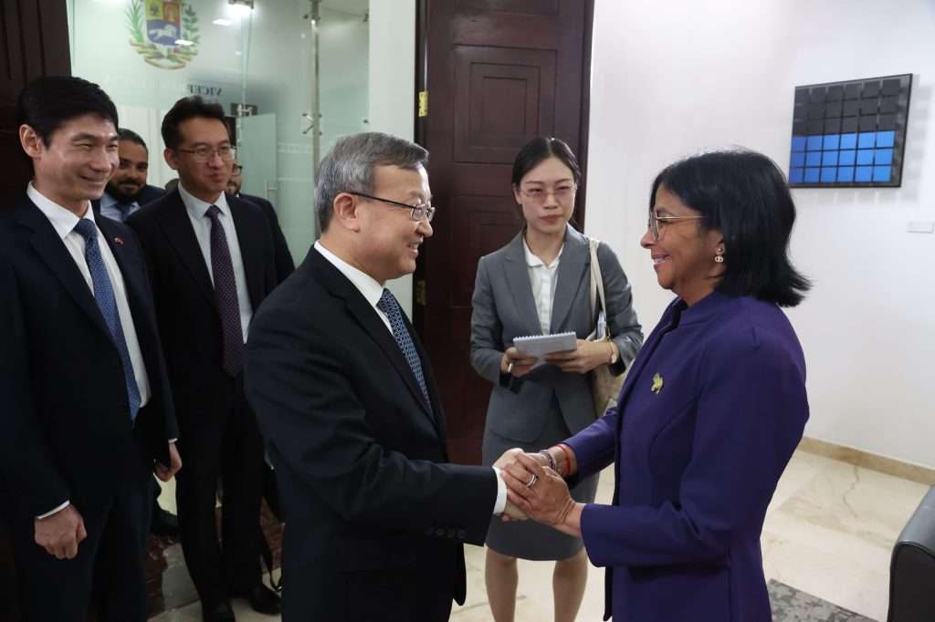 Este lunes la Vicepresidenta Delcy Rodríguez sostuvo un encuentro en la sede de la Vicepresidencia en Caracas con el Representante del Comercio Internacional de la República Popular China, Wang Shouwen, en el que abordaron temas en materia comercial y de cooperación entre ambas naciones.