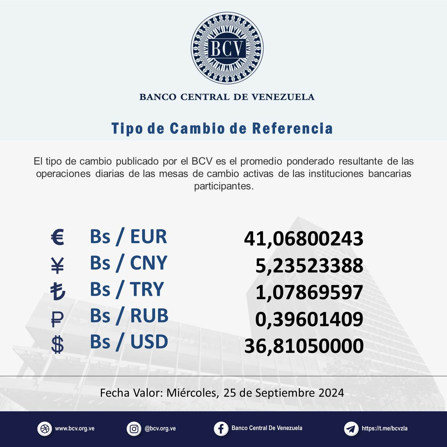 El Banco Central de Venezuela informó que las mesas de cambio de ayer arrojaron un promedio de 36,81 bolívares por dólar. Recuerda que esta es la única tasa válida para cualquier transacción del día de hoy.