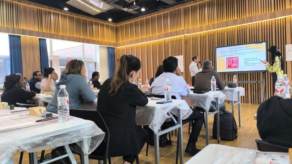 Con las herramientas dispuestas sobre una mesa, los comunicadores, dispuestos con buen pulso y un poco de paciencia, comenzaron a grabar un sencillo carácter chino.