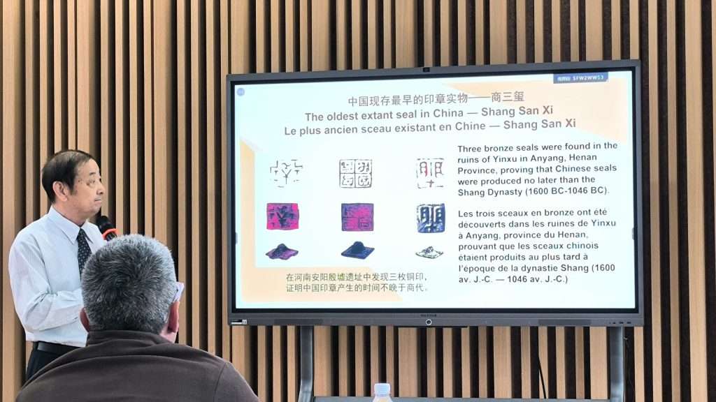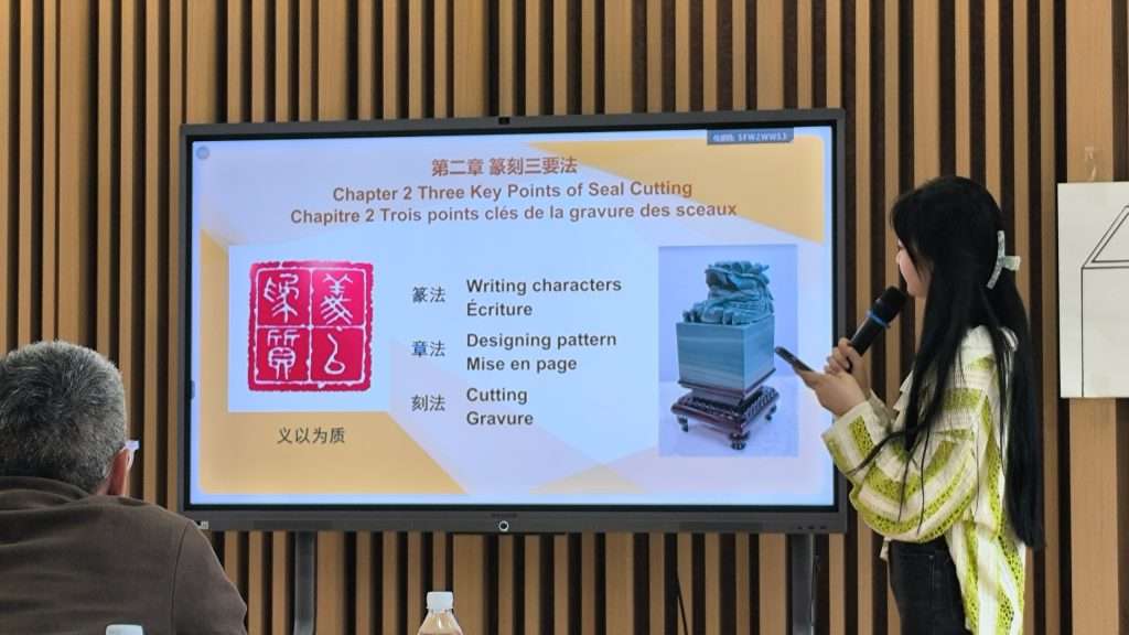 El profesor Li Zhe explicó que estos sellos tienen una parte superior denominada niǔ, y generalmente se talla con forma de animales; la parte central llamada shēn (cuerpo del sello), donde se graban los bordes decorativos; mientras la parte inferior es la miàn (cara del sello), y es justamente esa parte la que se debe tallar.
